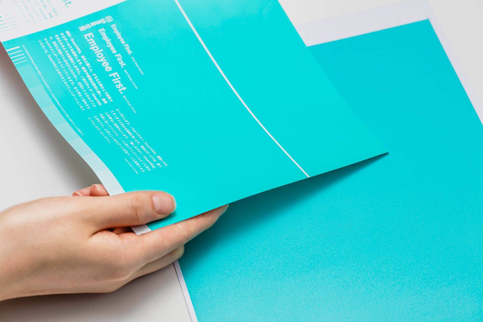 特色印刷、4色印刷どちらの場合でも、SmartHR Blueの色を指定・確認する際にはカラーチップの色を基準とします。ただしインクの練り具合、用紙の違い、温度や湿度などさまざまな要因により、厳密に全く同じ色にすることは難しいという前提で使用してください。