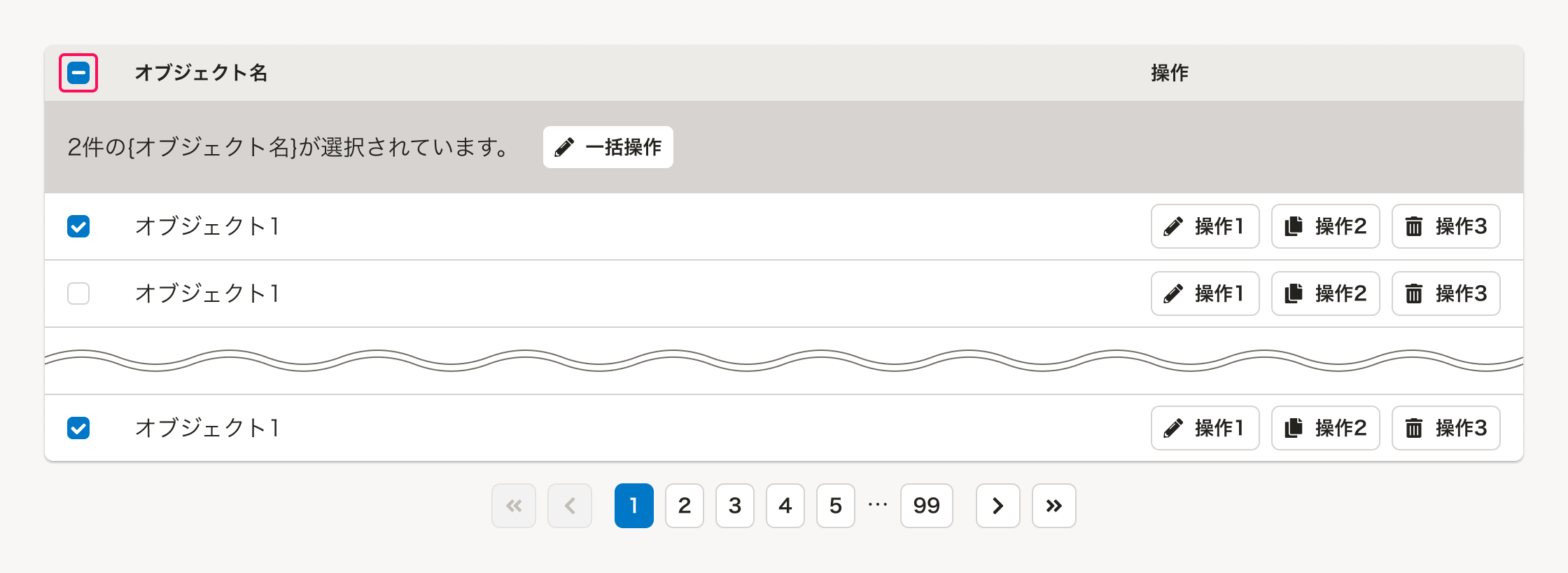 テーブル内の一括操作の「一括選択するチェックボックス」など、複数のチェックボックスの状態をまとめて示す必要があるチェックボックスにおいて、選択状態と未選択状態が混ざっている状態を示す場合には、混在選択状態(mixed=true)を採用します。