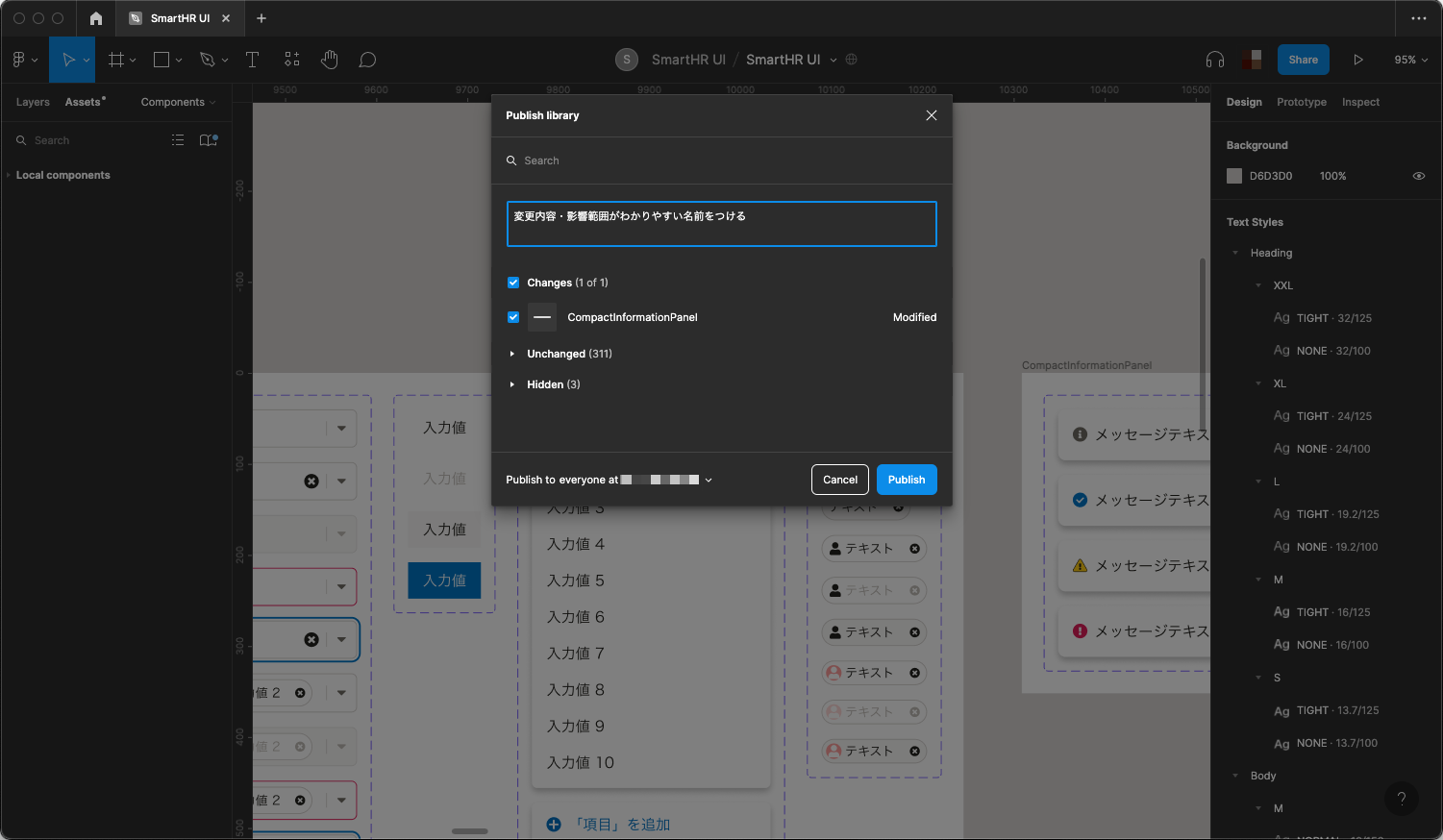 変更内容・影響範囲がわかりやすいコメントをつけて「Publish」を押すと変更内容が公開されます。公開後は、ライブラリを読み込んでいるすべてのファイルに即適用されるわけではなく、ファイルごとに更新を取り込むかどうかの確認があります(更新ごとに取り込む・取り込まないを選択できます)。