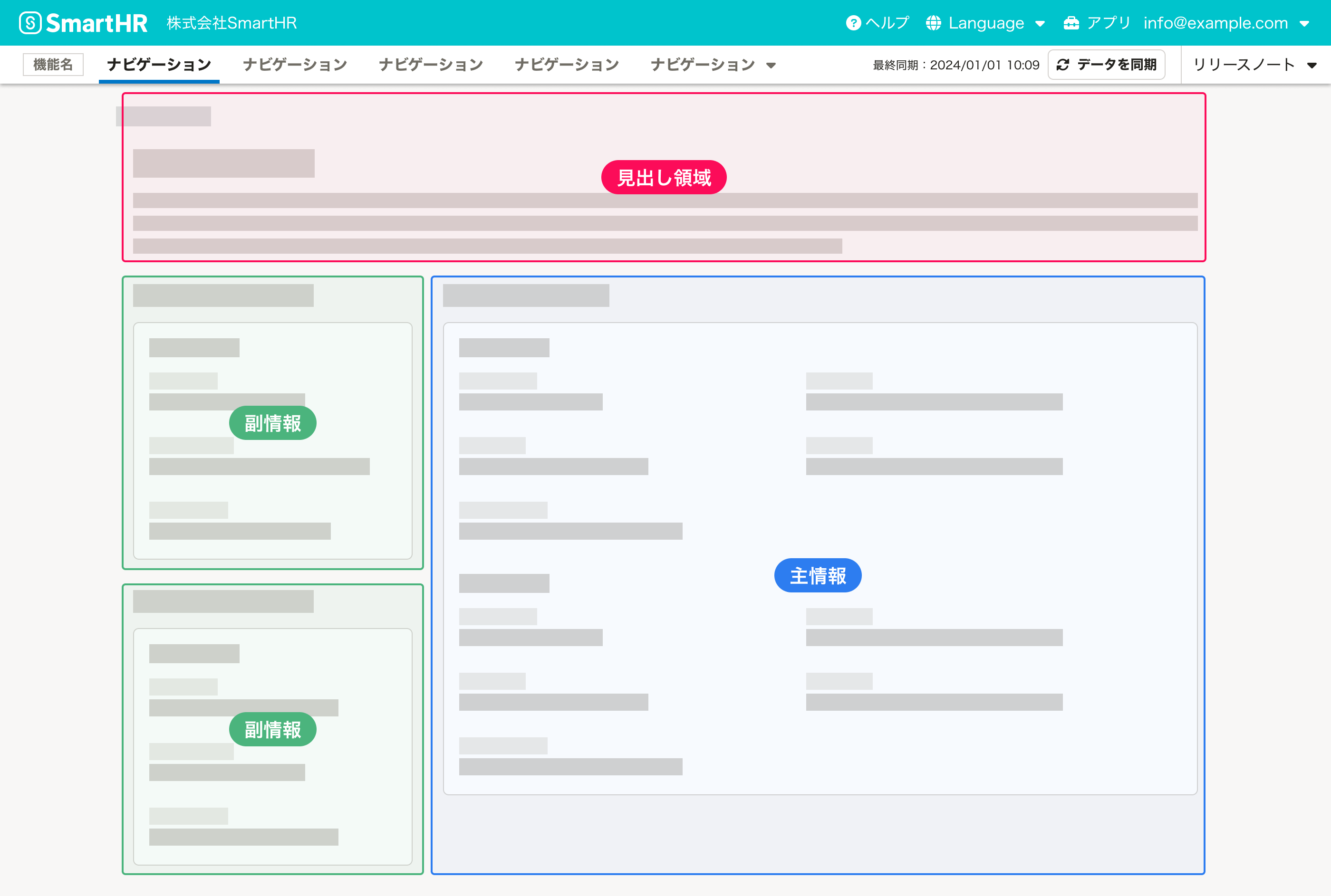 見出し領域と副情報のセクション、主情報のセクションで構成されます。主情報を表示する領域の横幅は副情報を表示する領域の横幅の2倍以上の幅としてください。