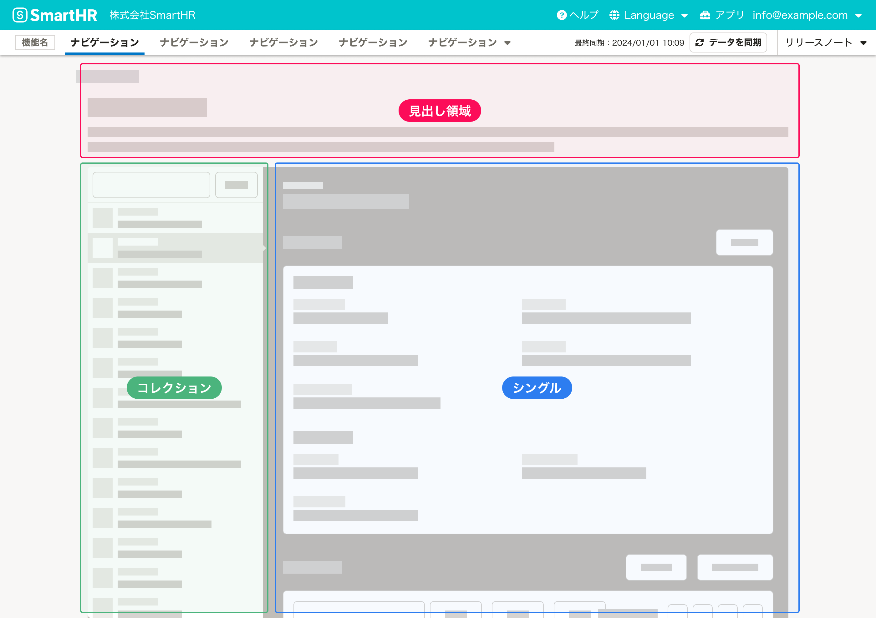 サイドナビゲーション領域とコンテンツ領域で構成されます。コンテンツ領域はコレクションかシングルのレイアウトをとります。