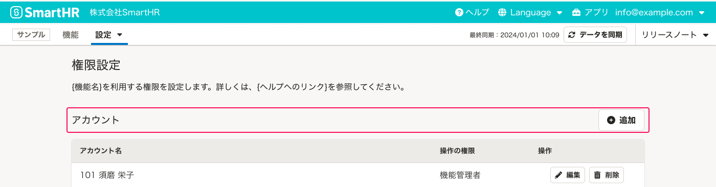 アカウントに対して操作の権限(役割)を設定します。以下に代表的な役割として 「機能管理者」「業務担当者」 の2つを定義します。必要に応じて見直してください。