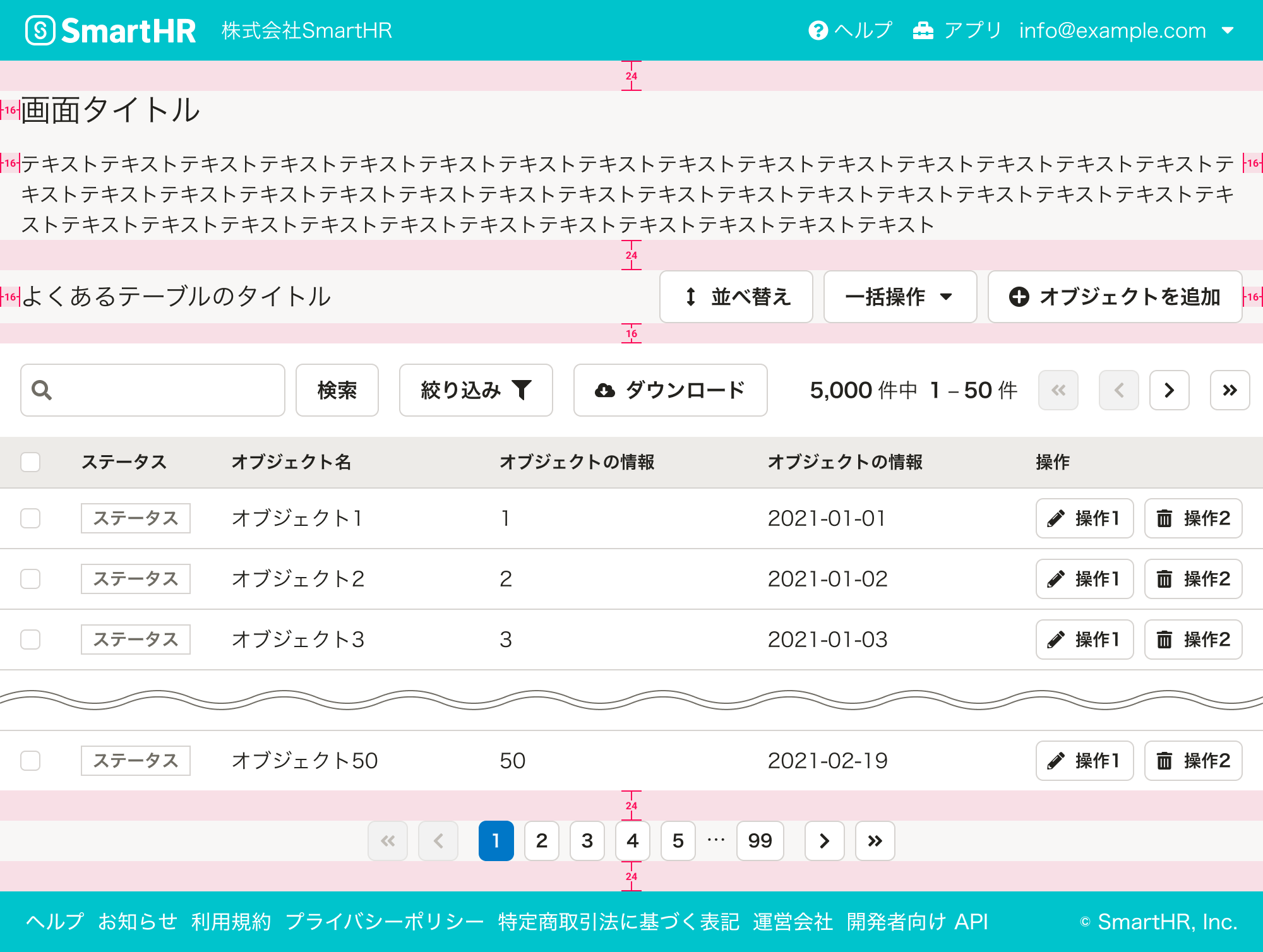 | テーブルのページ数、ページ番号 | 9,999 件中 1-5 件 | 多くの場合、「{総件数} 件中 {表示している順番の範囲} 件」のように、現在表示しているテーブル内容の現在位置を示します。1ページあたり20件〜50件とすることが多いですが、ユースケースや表示速度を考慮して適切な件数を設定します。 コンテンツの横幅に応じて、表示する内容の量を検討してください。 |