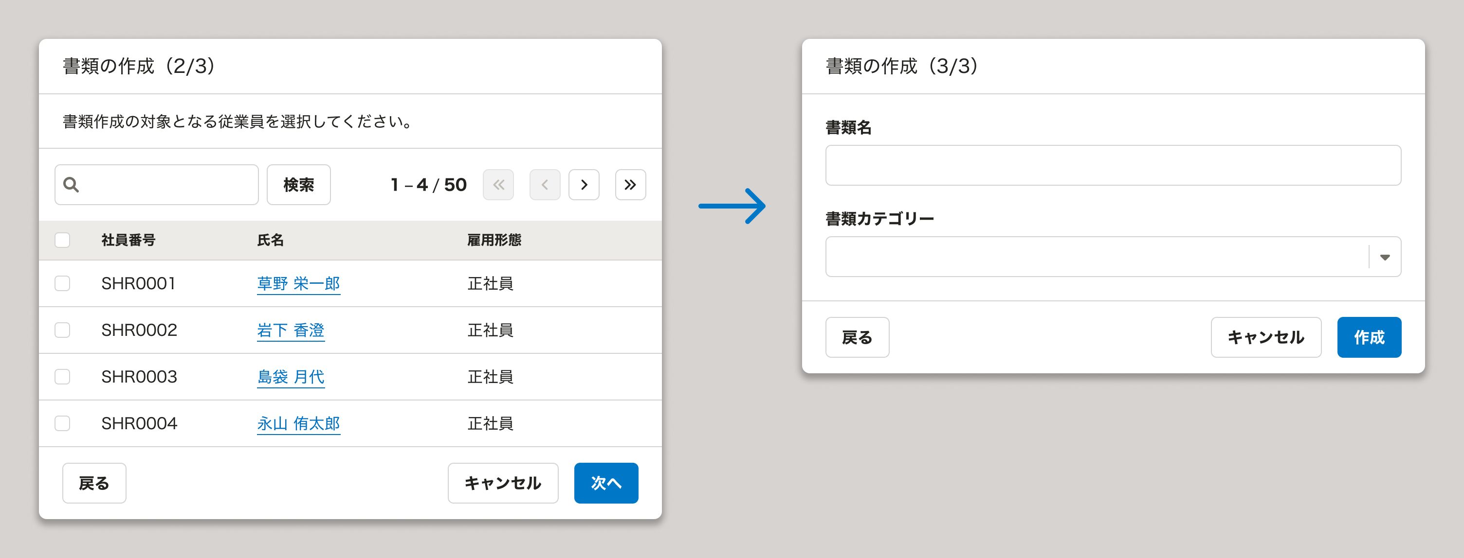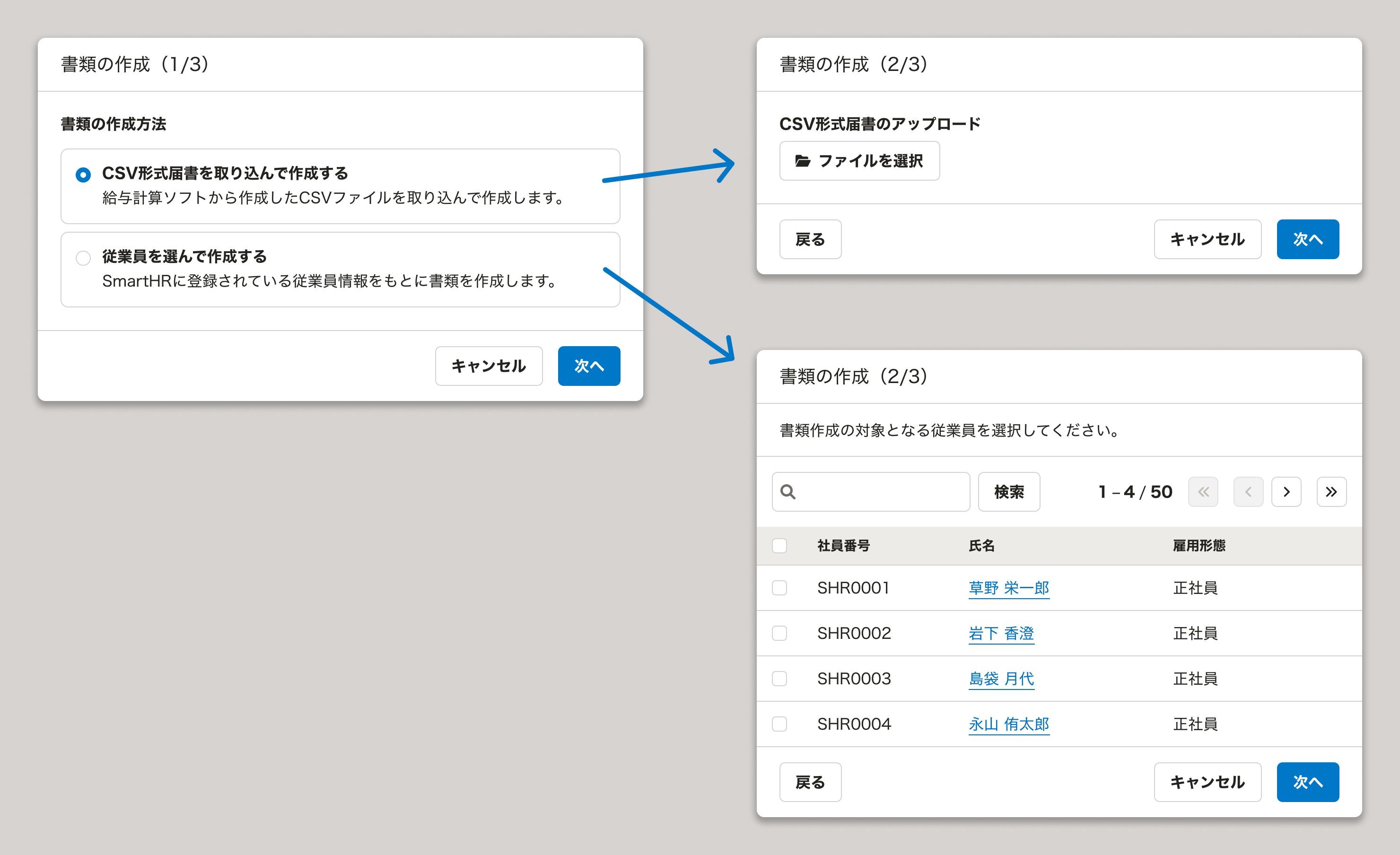 ウィザードは、基本的にはモーダルダイアログを使って提供します。SmartHRでは、専用のコンポーネントとしてStepFormDialogを用意しています。
