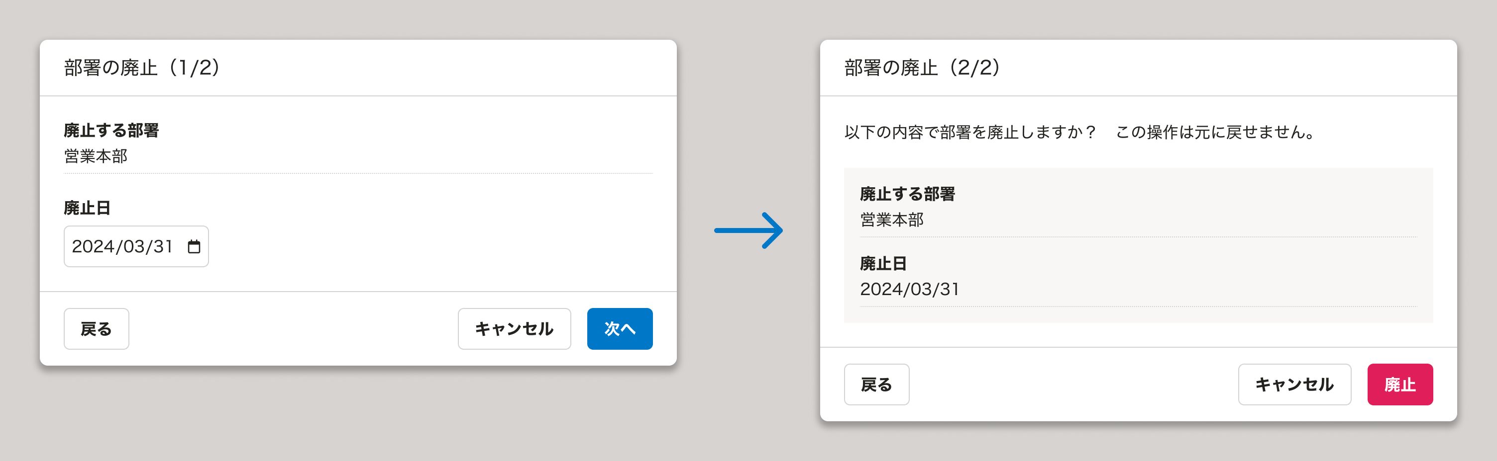 キャンセルとします。 - ボタンを押すと、ユーザーがウィザードで途中まで操作した内容は破棄され、ウィザードを開始する前の画面に移動します。